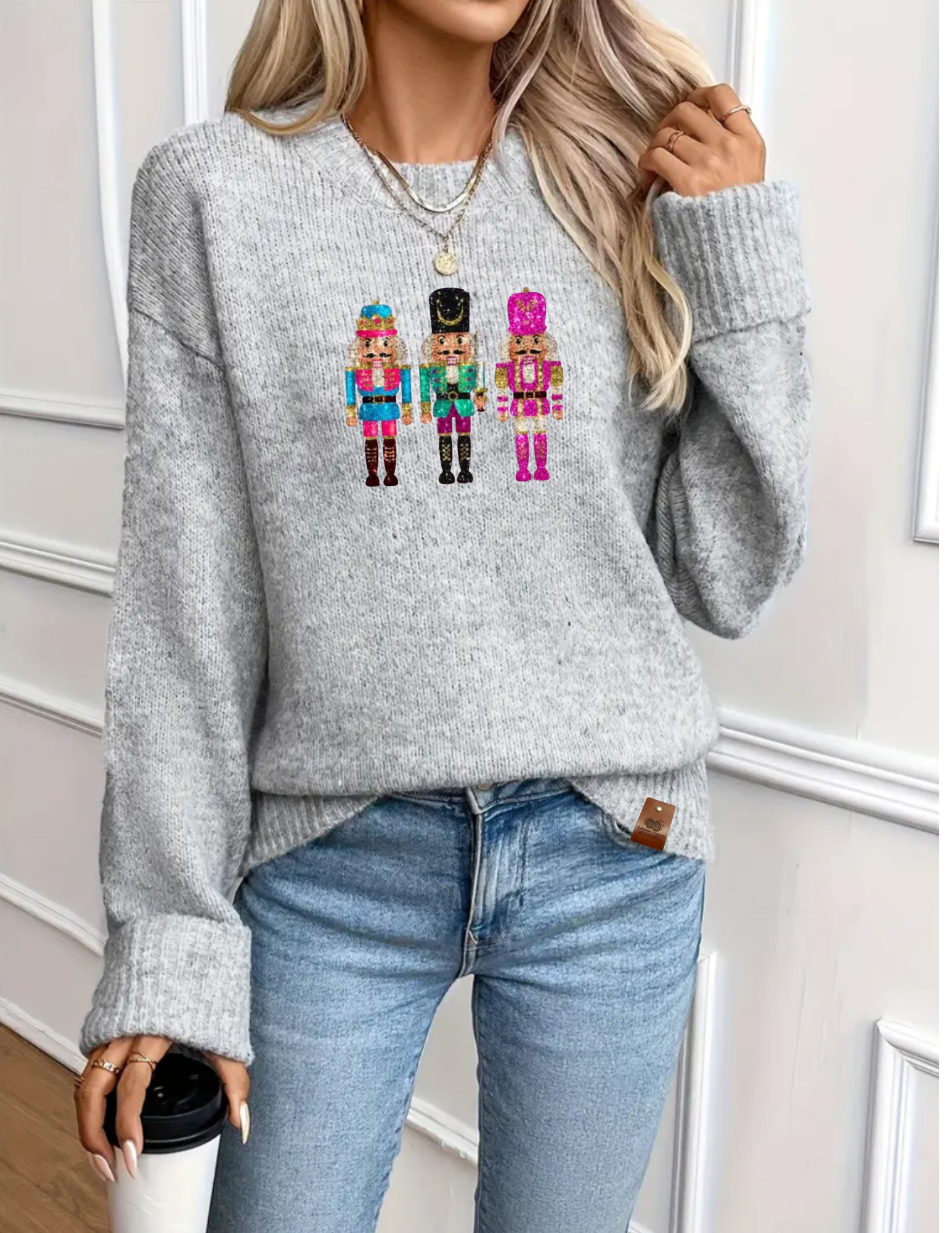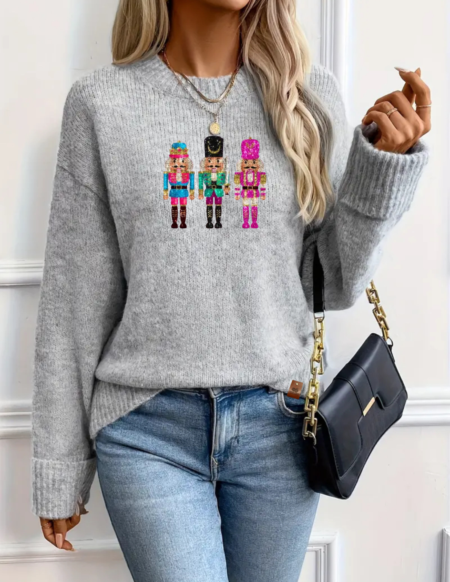 Lovingly knit from buttery-soft premium yarn, this winter-gray sweater features three sparkling sequin Nutcrackers across the front â each one detailed with bright pops of pink, blue, and gold for that perfect mix of tradition and trend. Itâs a modern twist on a timeless holiday classic, designed for the mama who loves a little glam with her cocoa.
