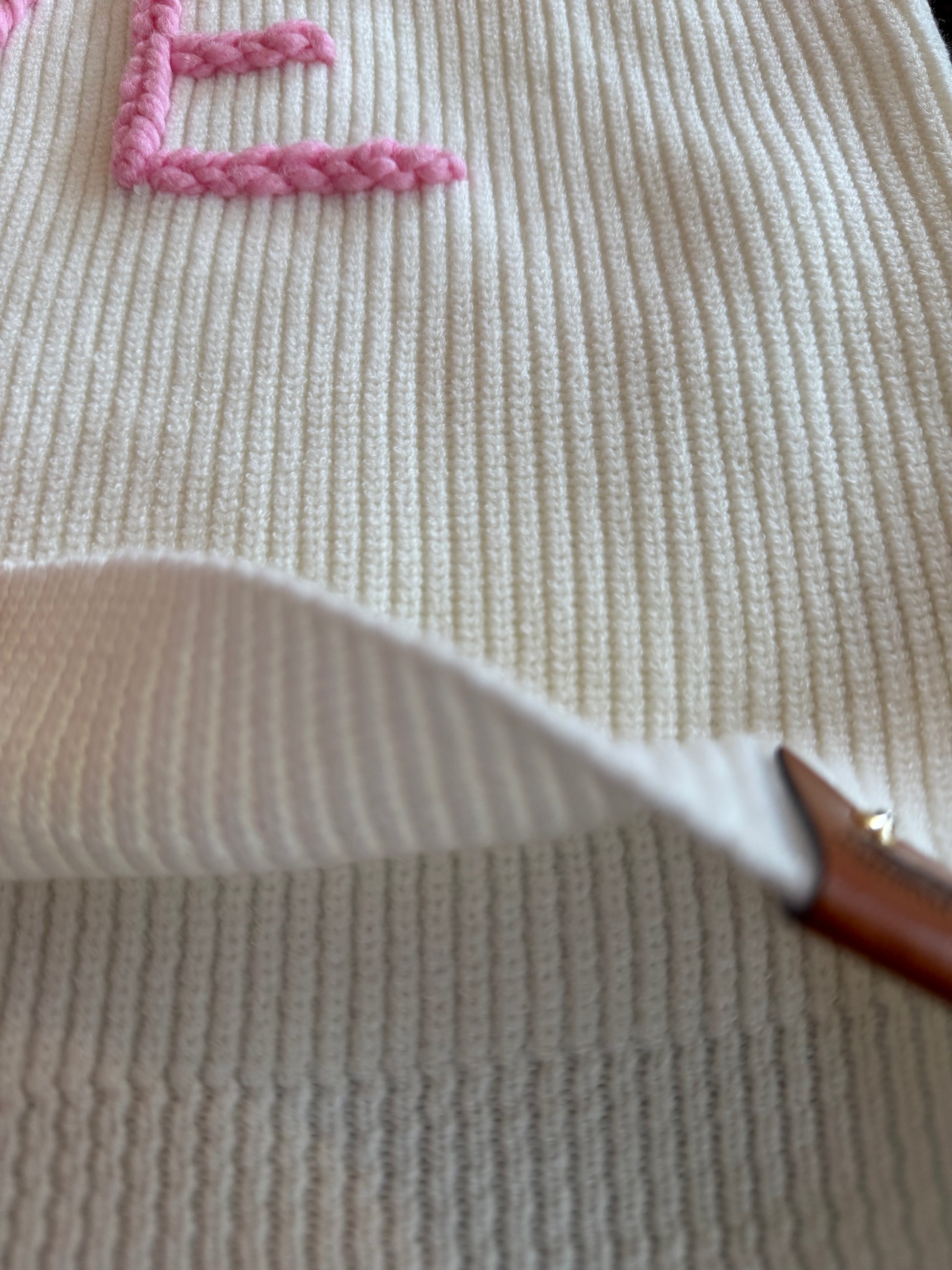 - Soft, creamy ivory ribbed knit sweater